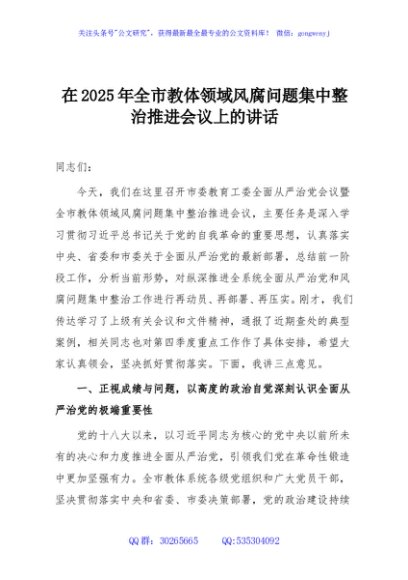 / 在2025年全市教体领域风腐问题集中整治推进会议上的讲话
