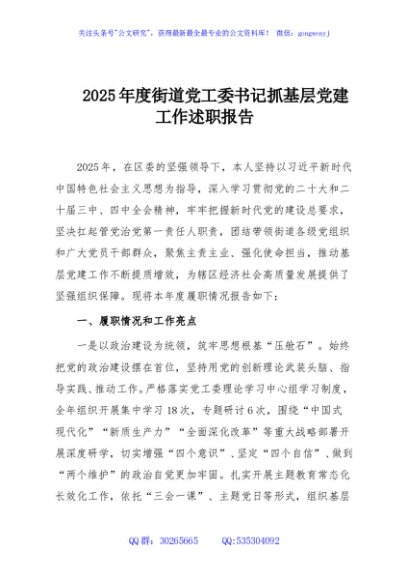 / 2025年度街道党工委书记抓基层党建工作述职报告