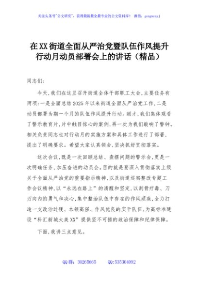 / 在XX街道全面从严治党暨队伍作风提升行动月动员部署会上的讲话(精品)