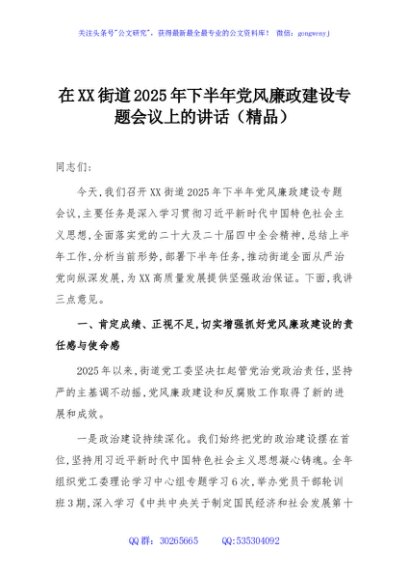 / 在XX街道2025年下半年党风廉政建设专题会议上的讲话(精品)