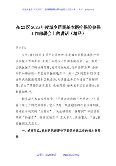 / 在XX区2026年度城乡居民基本医疗保险参保工作部署会上的讲话(精品)