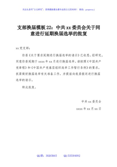 / 支部换届模板22:中共xx委员会关于同意进行延期换届选举的批复