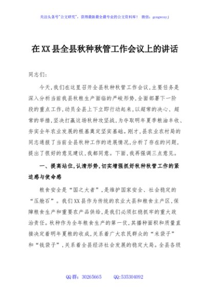 / 在XX县全县秋种秋管工作会议上的讲话