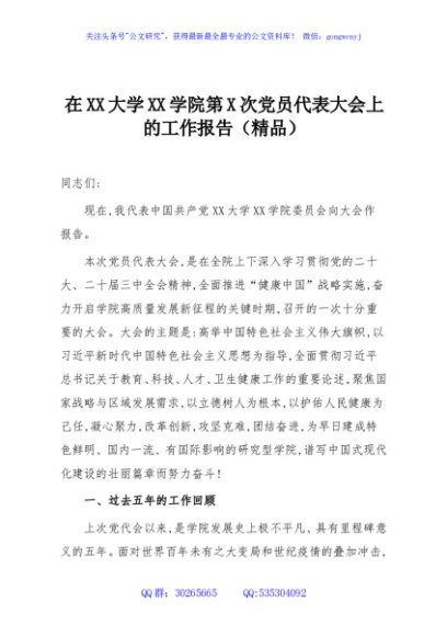 / 在XX大学XX学院第X次党员代表大会上的工作报告(精品)