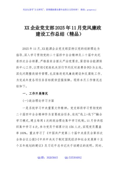 / XX企业党支部2025年11月党风廉政建设工作总结(精品)