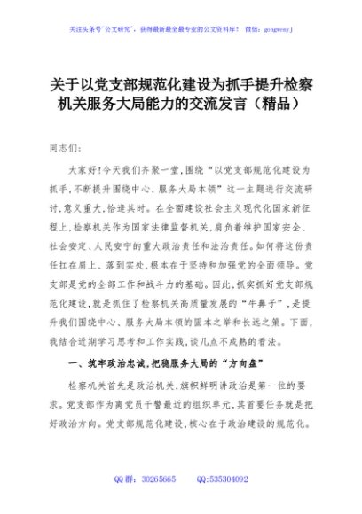 / 关于以党支部规范化建设为抓手提升检察机关服务大局能力的交流发言(精品)
