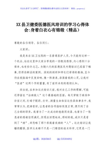 / XX县卫健委医德医风培训的学习心得体会:身着白衣心有锦缎(精品)