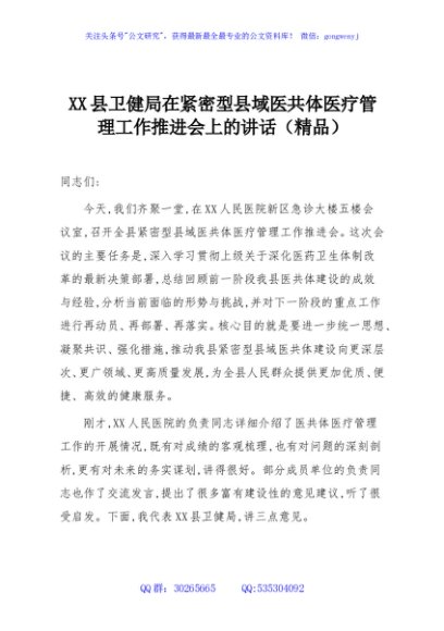 / XX县卫健局在紧密型县域医共体医疗管理工作推进会上的讲话(精品)