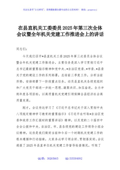 / 在县直机关工委委员2025年第三次全体会议暨全年机关党建工作推进会上的讲话