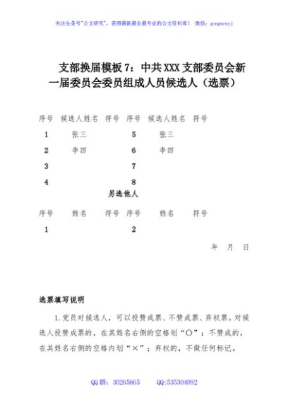 / 支部换届模板7:中共XXX支部委员会新一届委员会委员组成人员候选人(选票)