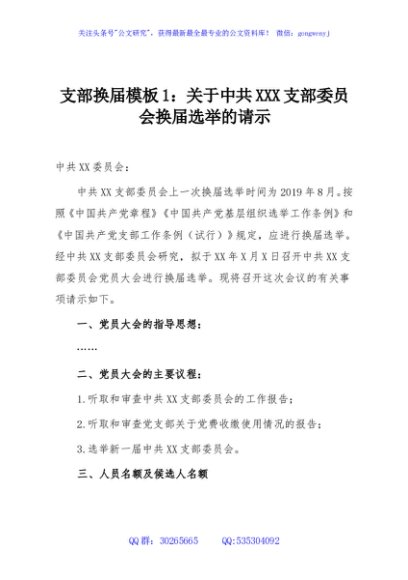 / 支部换届模板1:关于中共XXX支部委员会换届选举的请示