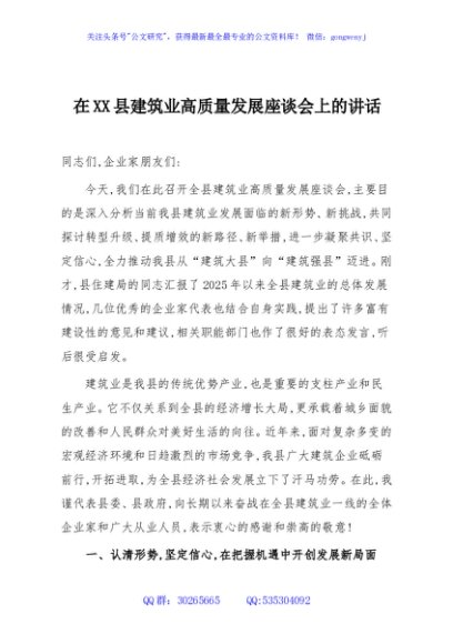 / 在XX县建筑业高质量发展座谈会上的讲话