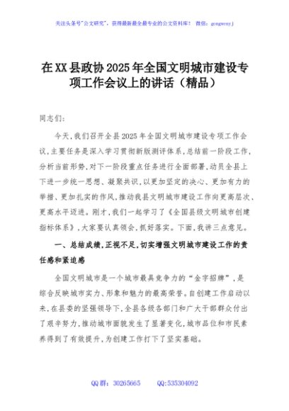/ 在XX县政协2025年全国文明城市建设专项工作会议上的讲话(精品)