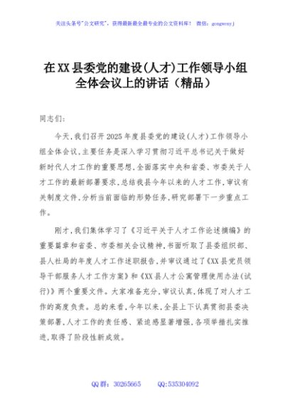 / 在XX县委党的建设(人才)工作领导小组全体会议上的讲话(精品)