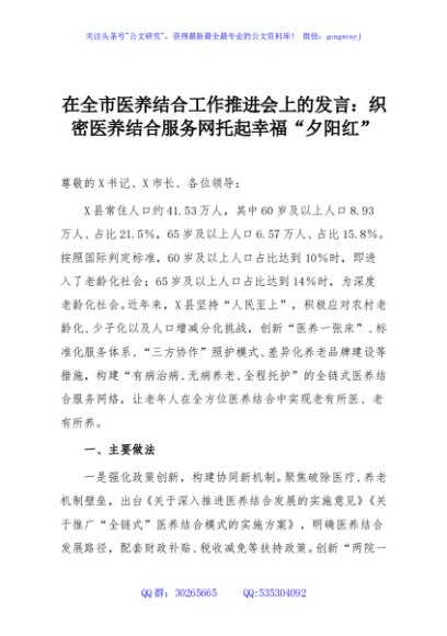 / 在全市医养结合工作推进会上的发言:织密医养结合服务网托起幸福“夕阳红”
