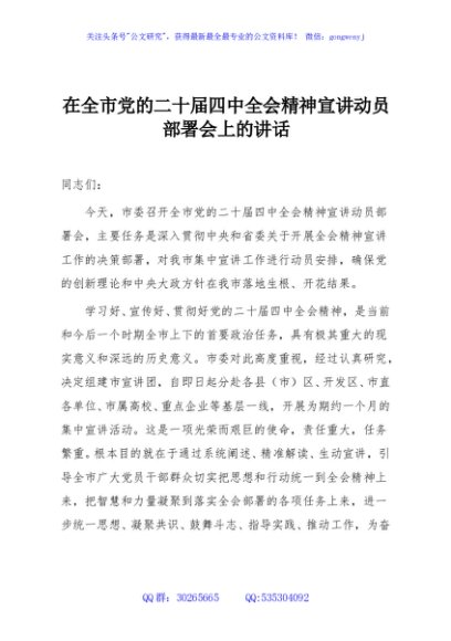/ 在全市党的二十届四中全会精神宣讲动员部署会上的讲话