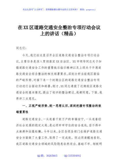 / 在XX区道路交通安全整治专项行动会议上的讲话(精品)