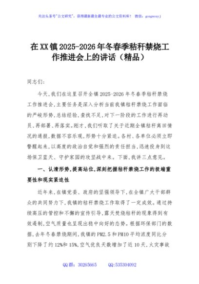 / 在XX镇2025-2026年冬春季秸秆禁烧工作推进会上的讲话(精品)