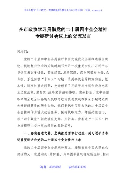 / 在市政协学习贯彻党的二十届四中全会精神专题研讨会议上的交流发言