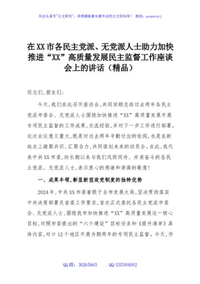 / 在XX市各民主党派、无党派人士助力加快推进“XX”高质量发展民主监督工作座谈会上的讲话(精品)