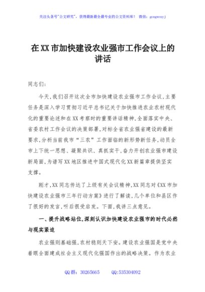 / 在XX市加快建设农业强市工作会议上的讲话
