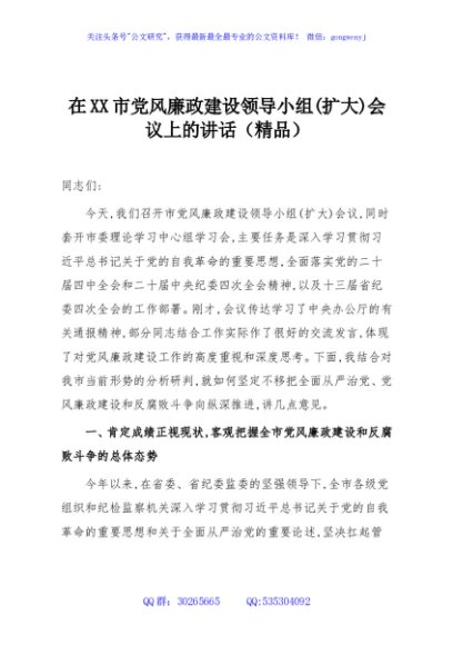 / 在XX市党风廉政建设领导小组(扩大)会议上的讲话(精品)