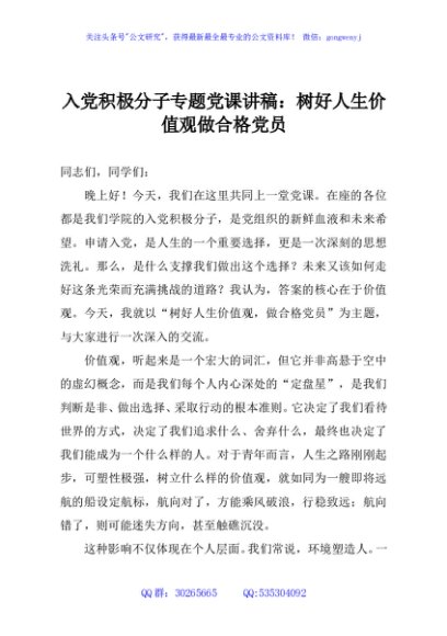 / 入党积极分子专题党课讲稿:树好人生价值观做合格党员