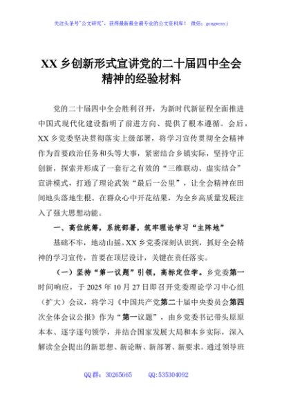 XX乡创新形式宣讲党的二十届四中全会精神的经验材料