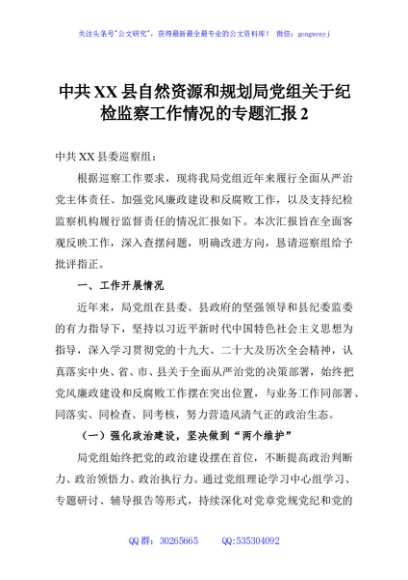 / 中共XX县自然资源和规划局党组关于纪检监察工作情况的专题汇报2