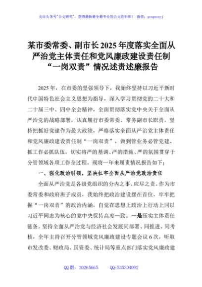 / 某市委常委、副市长2025年度落实全面从严治党主体责任和党风廉政建设责任制“一岗双责”情况述责述廉报告