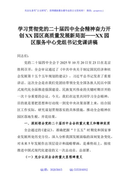 / 学习贯彻党的二十届四中全会精神奋力开创XX园区高质量发展新局面——XX园区服务中心党组书记党课讲稿