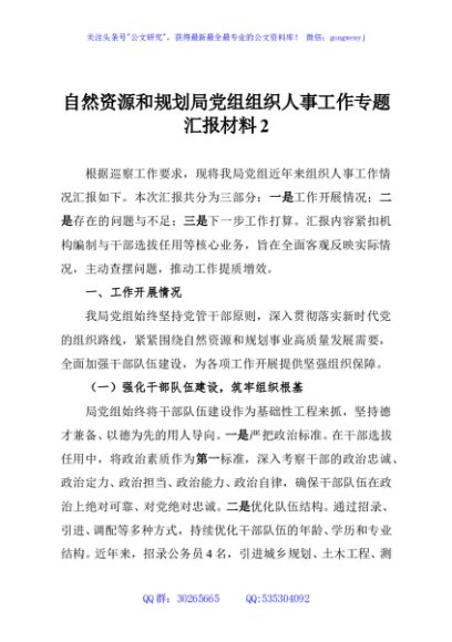 / 自然资源和规划局党组组织人事工作专题汇报材料2