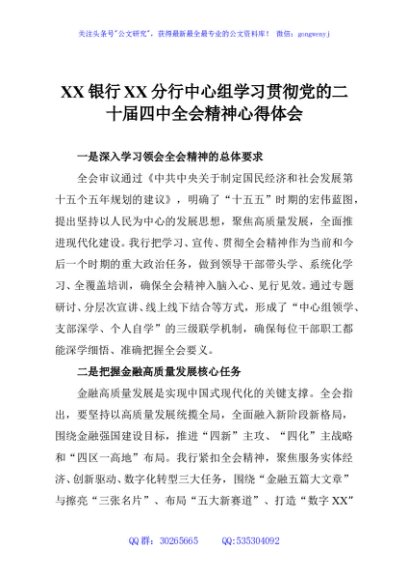 / XX银行XX分行中心组学习贯彻党的二十届四中全会精神心得体会