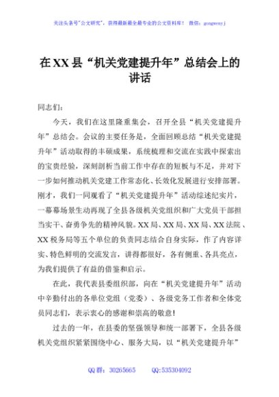 / 在XX县“机关党建提升年”总结会上的讲话