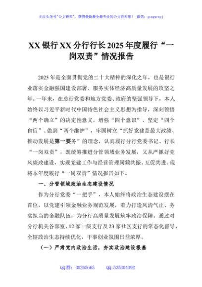 / XX银行XX分行行长2025年度履行“一岗双责”情况报告