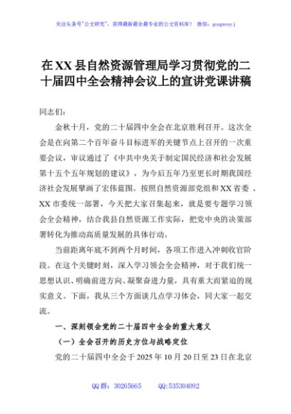 / 在XX县自然资源管理局学习贯彻党的二十届四中全会精神会议上的宣讲党课讲稿