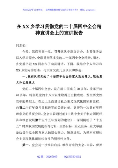 / 在XX乡学习贯彻党的二十届四中全会精神宣讲会上的宣讲报告