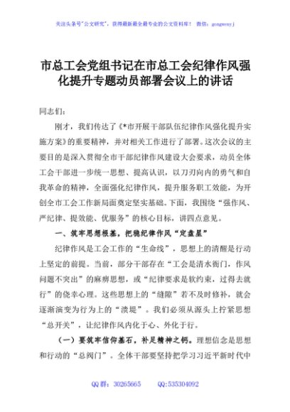 / 市总工会党组书记在市总工会纪律作风强化提升专题动员部署会议上的讲话