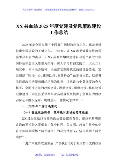 / XX县血站2025年度党建及党风廉政建设工作总结