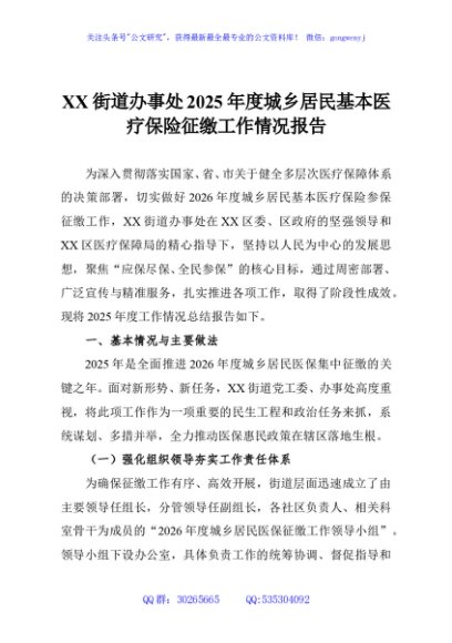 / XX街道办事处2025年度城乡居民基本医疗保险征缴工作情况报告
