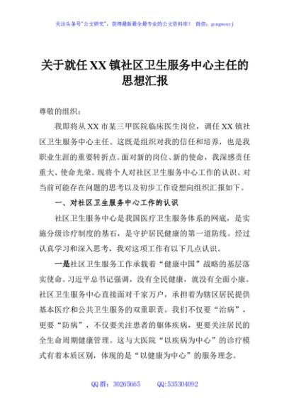 / 关于就任XX镇社区卫生服务中心主任的思想汇报