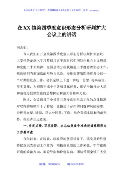 / 在XX镇第四季度意识形态分析研判扩大会议上的讲话