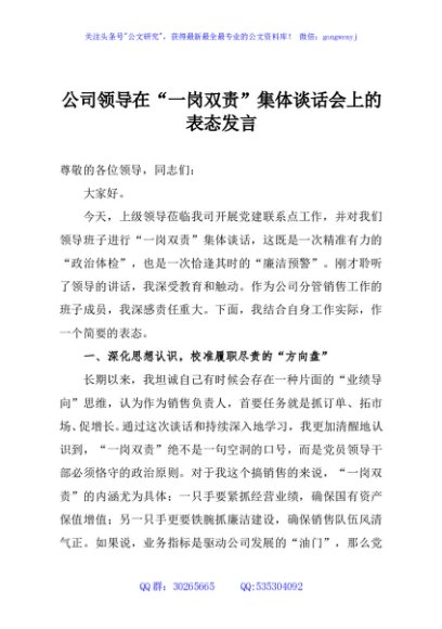 / 公司领导在“一岗双责”集体谈话会上的表态发言