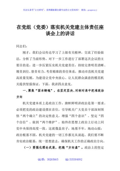 / 在党组(党委)落实机关党建主体责任座谈会上的讲话