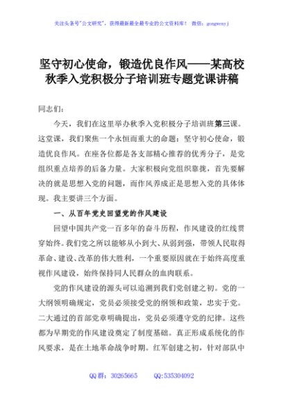 / 坚守初心使命,锻造优良作风——某高校秋季入党积极分子培训班专题党课讲稿