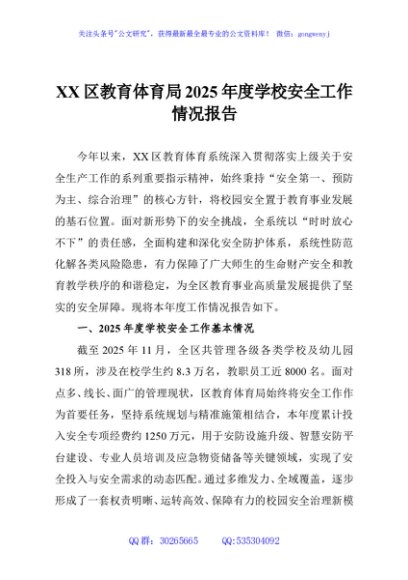 / XX区教育体育局2025年度学校安全工作情况报告
