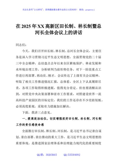 / 在2025年XX高新区田长制、林长制暨总河长全体会议上的讲话