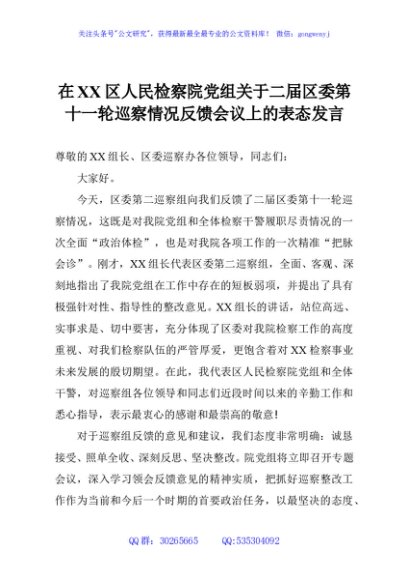 / 在XX区人民检察院党组关于二届区委第十一轮巡察情况反馈会议上的表态发言