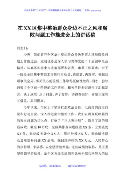 / 在XX区集中整治群众身边不正之风和腐败问题工作推进会上的讲话稿