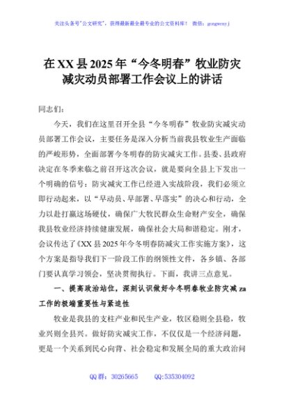 / 在XX县2025年“今冬明春”牧业防灾减灾动员部署工作会议上的讲话